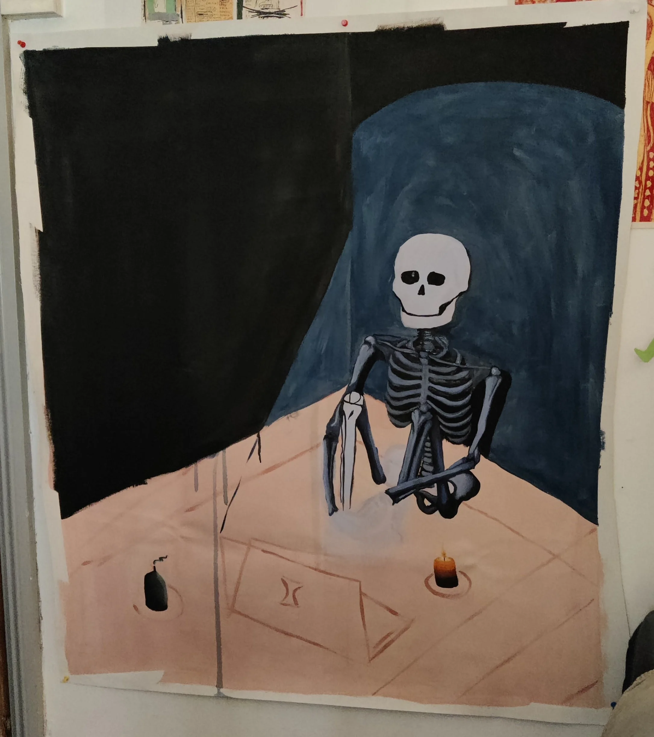 This painting I started in Feb, 2023, whilst I was on my year abroad in Hong Kong. My time in Hong Kong was complicated, I had some brilliant experiences, however due to financial issues it was a struggle as well. My mental health suffered during the latter part of the year and this painting, as well as depicting some of what was going through my mind at the time, also served as a distraction. Painting allows me to occupy my thoughts and distract myself from focusing on the negatives. This painting, somewhat optimistically, has remained unfinished since I returned from Hong Kong. However I do plan on finishing it soon when I have the space to do so.
